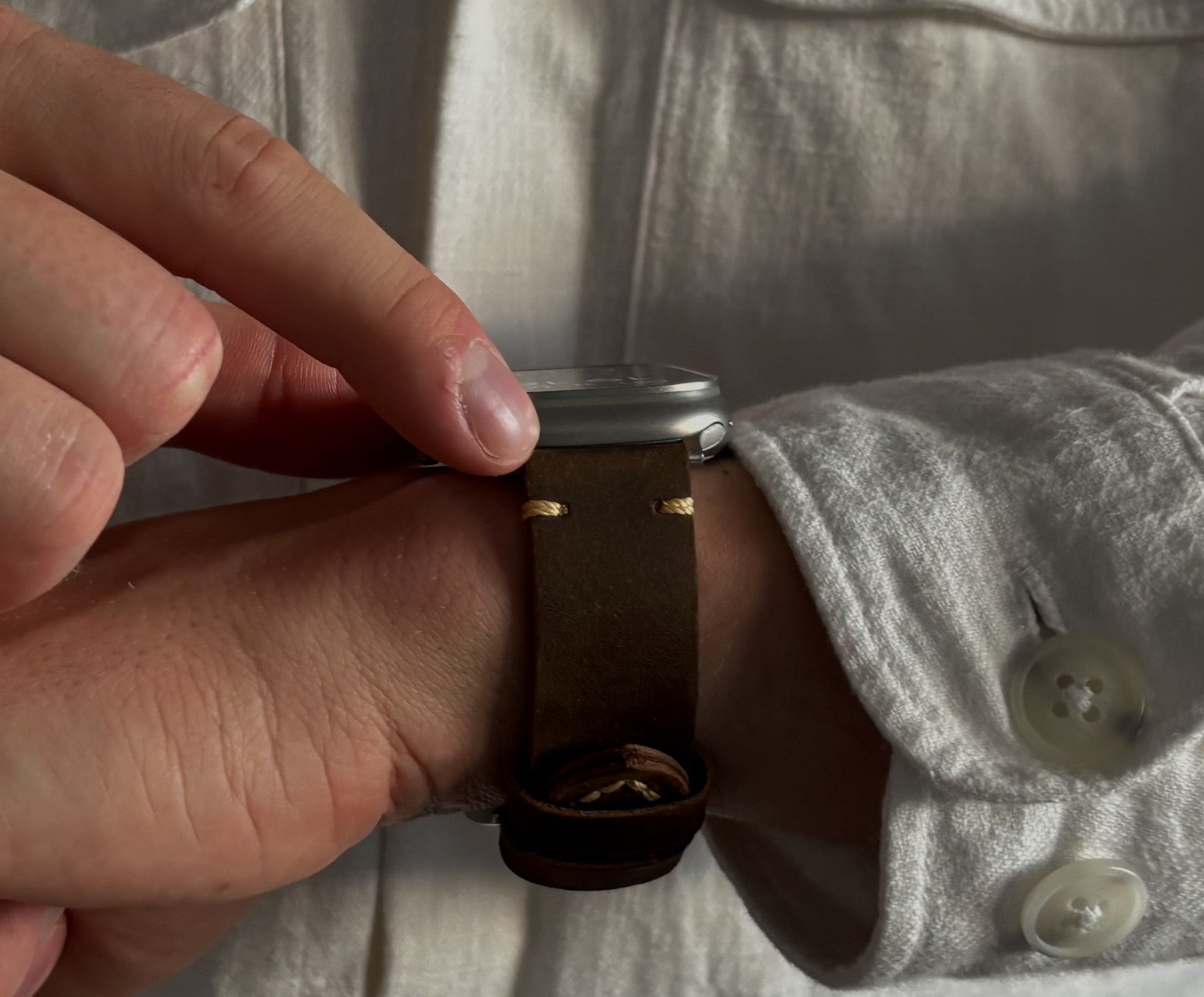 By the time, the material will perfectly mold into your wrist. Be aware, that the material can change its color when bent and used, because it is made from real leather. This makes every strap unique and develops a stylish finish to your personal strap.